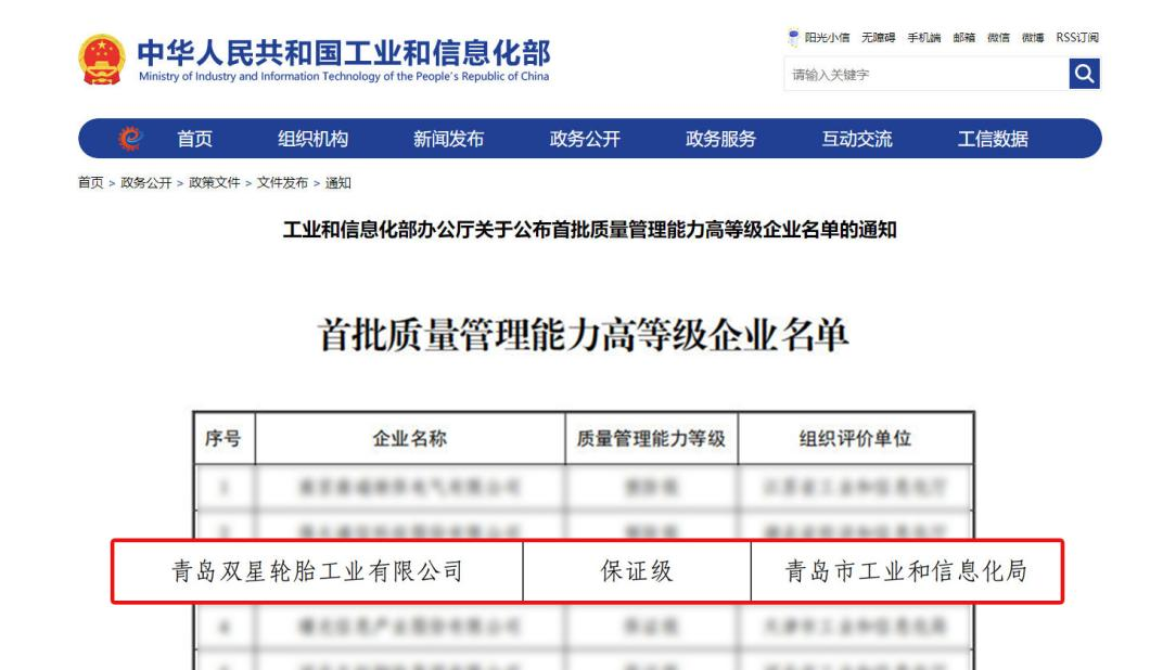 • 行業(yè)唯一!雙星輪胎入選工信部質(zhì)量管理能力高等級(jí)企業(yè)名單